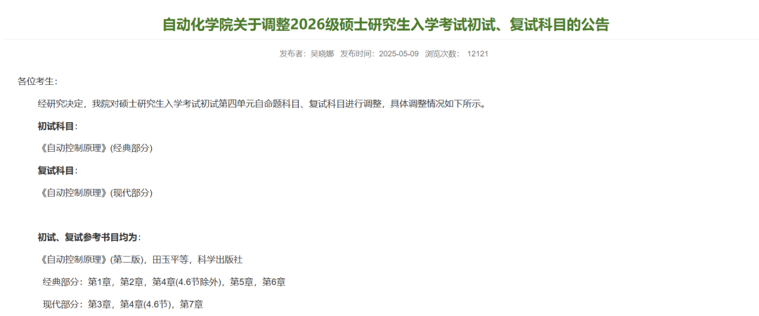 调整科目较多,目前已发布生命科学与技术学院、自动化学院、苏州联合研究生院、信息科学与工程学院、电气工程学院、土木工程学院、网络空间安全学院、经济管理学院、计算机科学与工程学院、生物科学与医学工程学院、马克思主义学院等院校科目调整通知,具体请查看官网