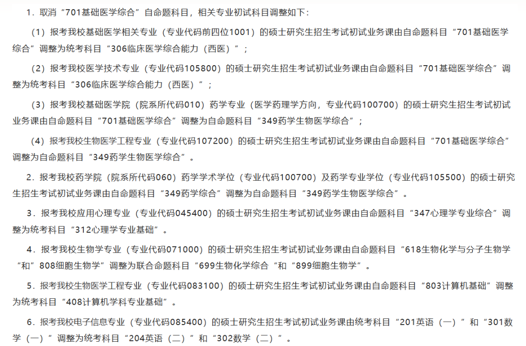 2.药学院:报考药学学术学位(专业代码100700)及药学专业学位(专业代码105500,自命题科目“349药学综合”调整为自命题科目“349药学生物医学综合”。