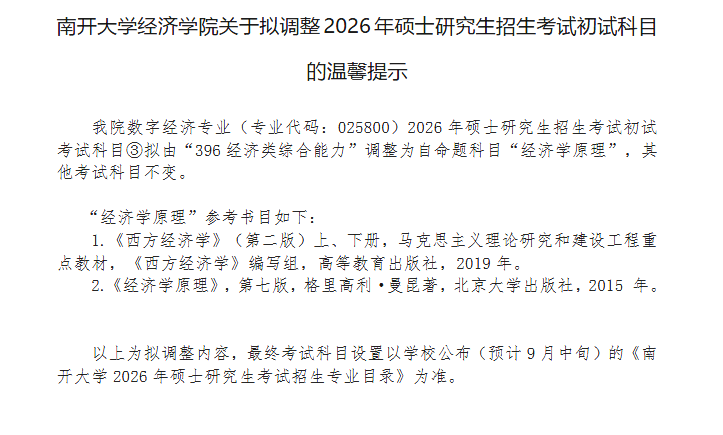 📌南开大学:经济学院→ 数字经济专业(专业代码:025800)2026年硕士研究生招生考试初试考试科目③拟由“396经济类综合能力”调整为自命题科目“经济学原理”,其他考试科目不变。