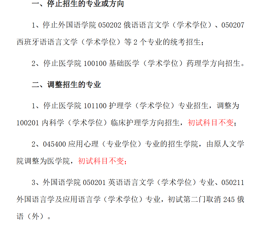 1、停止 外国语学院050202俄语语言文学(学术学位)、050207西班牙语语言文学(学术学位)等2个专业的统考招生 ;