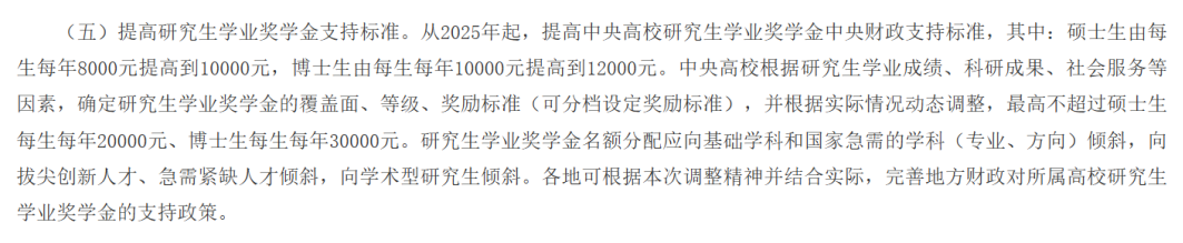 从2025年起,提高中央高校研究生学业奖学金中央财政支持标准。硕士生由每生每年8000元提高到10000元,博士生由每生每年10000元提高到12000元。中央高校根据研究生学业*、科研成果、社会服务等因素,确定研究生学业奖学金的覆盖面、等级、奖励标准(可分档设定奖励标准),并根据实际情况动态调整,*高不超过硕士生每生每年20000元、博士生每生每年30000元。研究生学业奖学金名额分配应向基础和国家急需的(专业、方向)倾斜,向拔尖创新人才、急需紧缺人才倾斜,向学术型研究生倾斜。