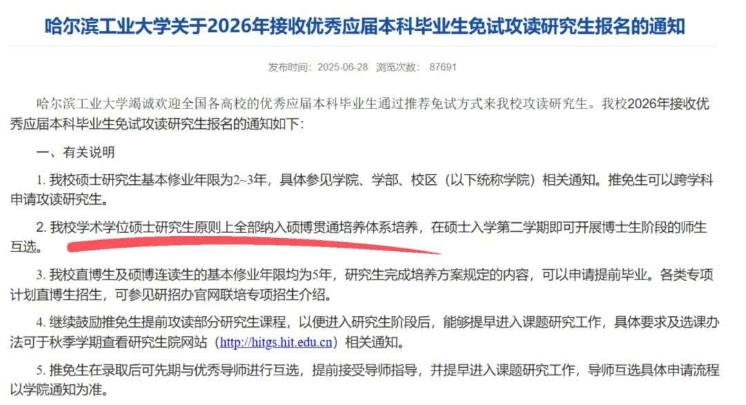哈尔滨工业大学发布推免生报名通知,其中提及“我校学术学位硕士研究生原则上全部纳入硕博贯通培养体系培养”。这意味新录取的学硕,从入学开始就被视为潜在的博士生候选人来培养。它不再是一项可选项,而是一项默认设置。