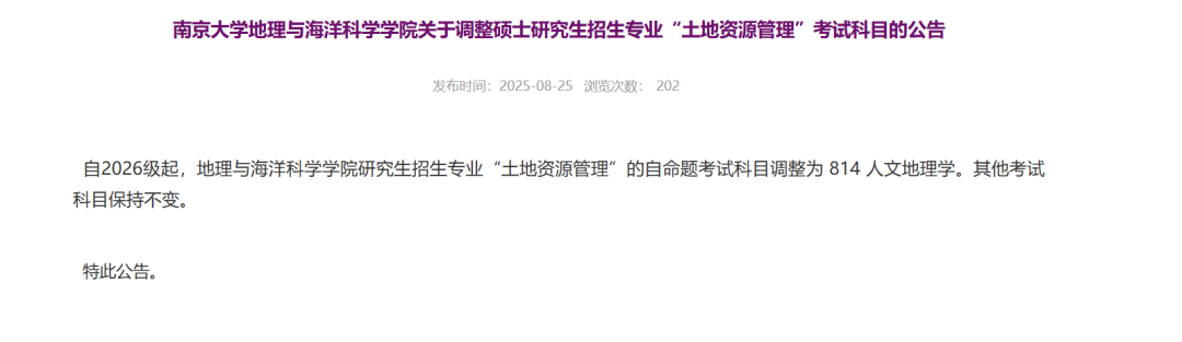 地理与海洋科学学院:“土地资源管理”的自命题考试科目调整为 814人文地理学。