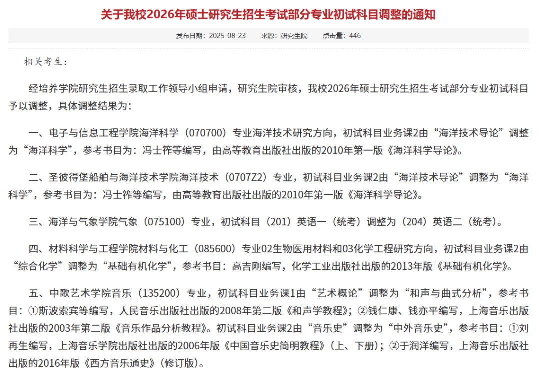 海洋技术(0707Z2)专业,初试科目业务课2由“海洋技术导论”调整为“海洋科学”(参考书目:《海洋科学导论》)