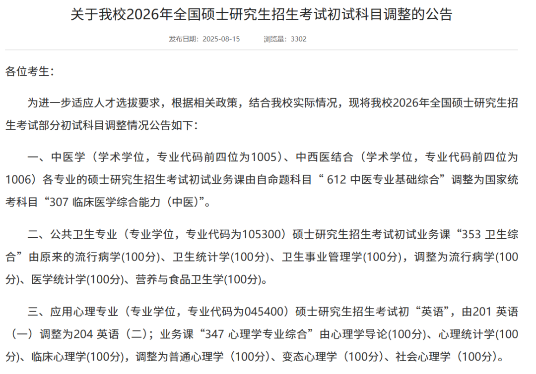各专业初试业务课:自命题科目“ 612 中医专业基础综合”调整为国家统考科目“307 临床医学综合能力(中医)”