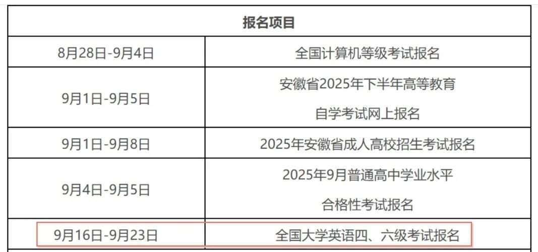 根据安徽省教育考试院官网发布的9月考试日历,全国大学四六级考试报名时间为9月16日-9月23日,考试时间预计为12月中旬,甚至更早一点。