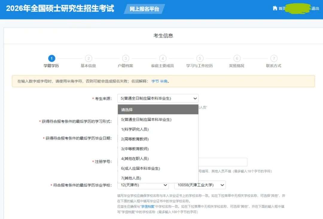 考生来源:应届生选“普通全日制应届本科毕业生”,成人应届选“成人应届本科毕业生”,往届生按实际状态填写即可。