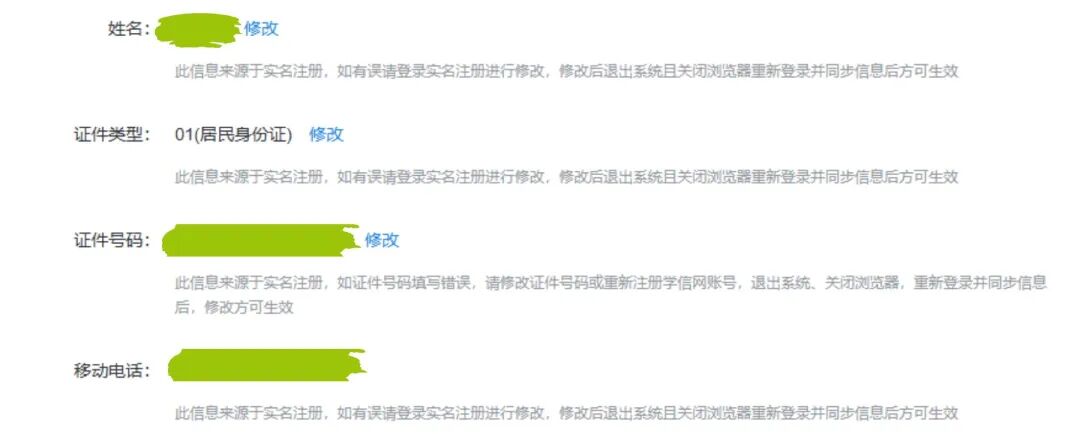 🆙 姓名、证件号码等来源于实名注册的信息,如果有填写错误的,要修改证件号码,重新注册学信网账号,退出系统、关闭浏览器,重新登录并同步信息后,修改才能生效。