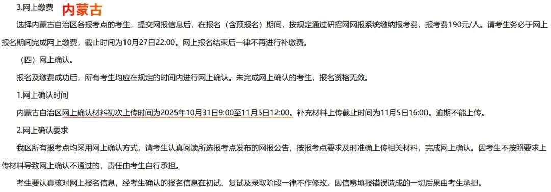 内蒙古网上确认时间:材料初次上传时间为2025年10月31日9:00至11月5日12:00。补充材料上传截止时间为11月5日16:00。