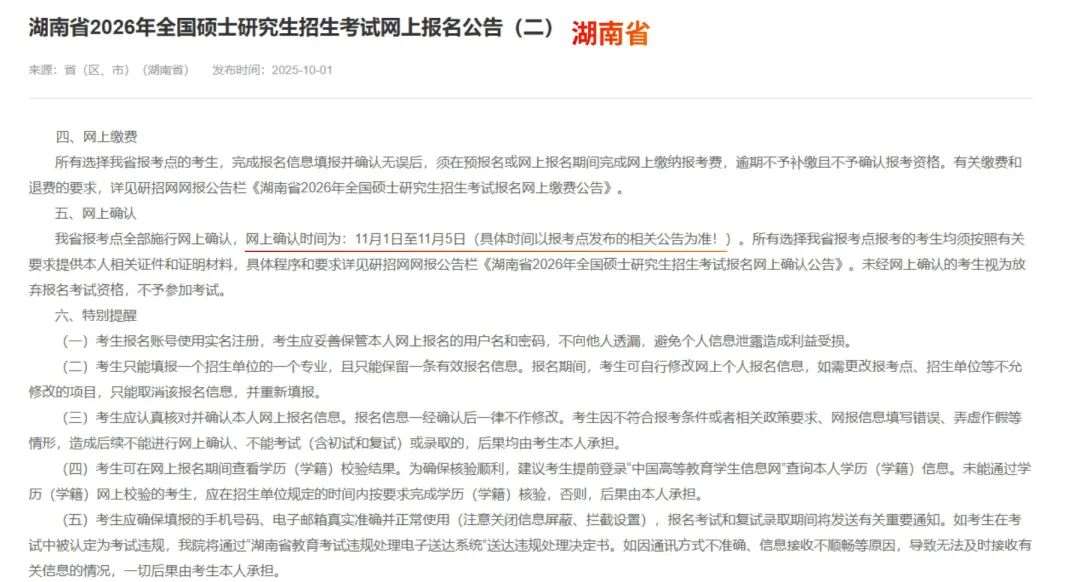湖南省网上确认时间:11月1日至11月5日(具体时间以报考点发布的相关公告为准!)