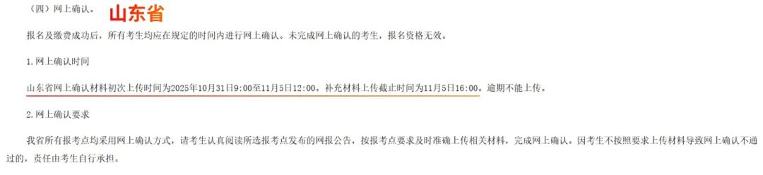山东省网上确认时间:网上确认材料初次上传时间为2025年10月31日9:00至11月5日12:00。补充材料上传截止时间为11月5日16:00。