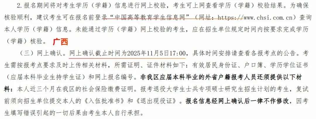 广西网上确认时间:截止时间为2025年11月5日17:00,具体时间安排请查看各报考点的公告。