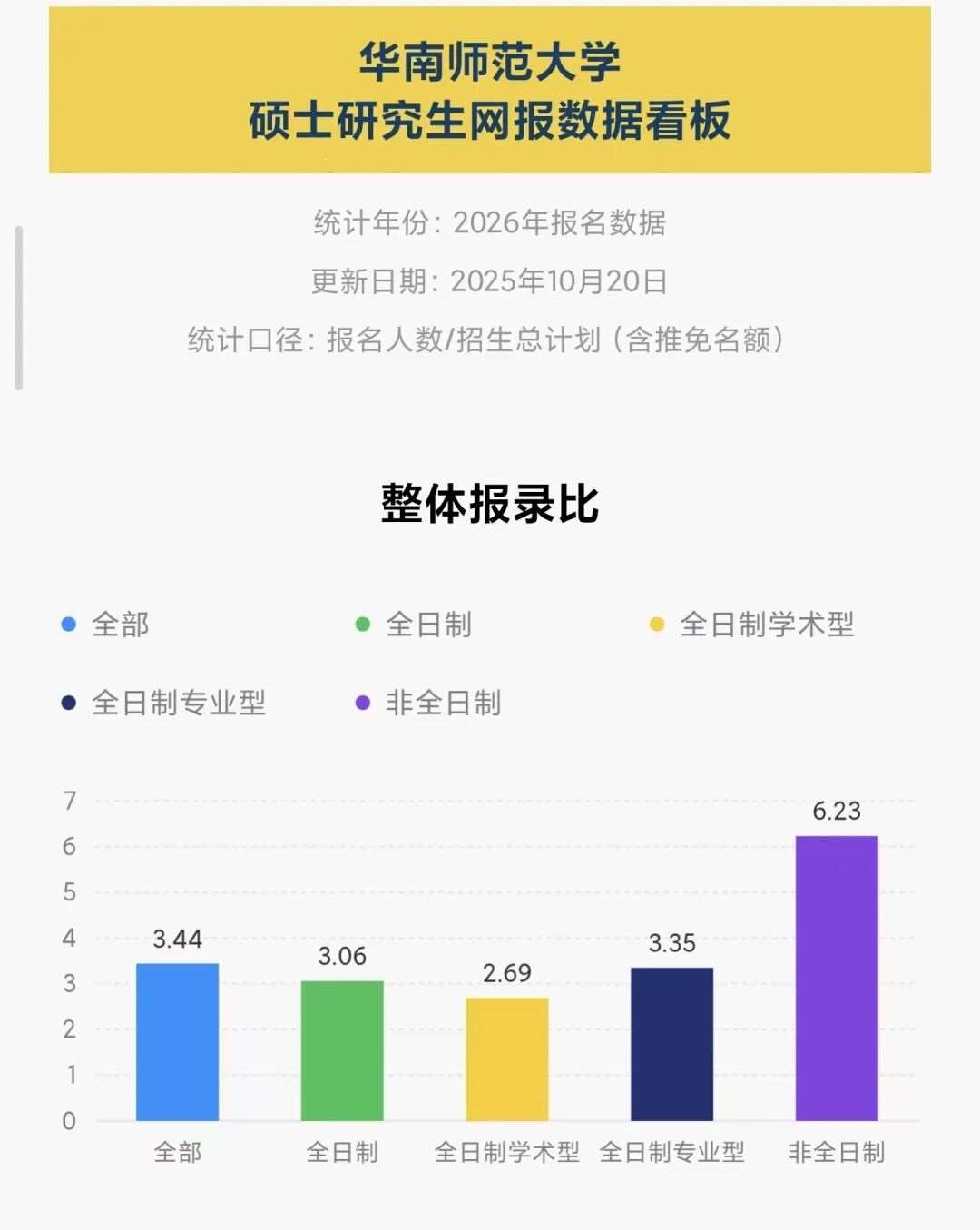 截止10月20日,全日制报录比为3.06,其中学硕为2.69,专硕为3.35,非全日制为6.23.报录比专业分布中,5以上的约有29个。关于具体专业报录比,大家可以在公众号直接查询实时报录比。
