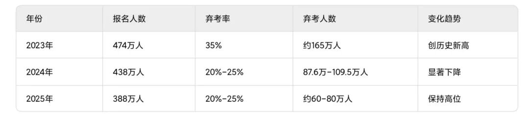 2025年:报名人数为388万人,弃考率约20%-25%,弃考人数约60-80万人保持高位