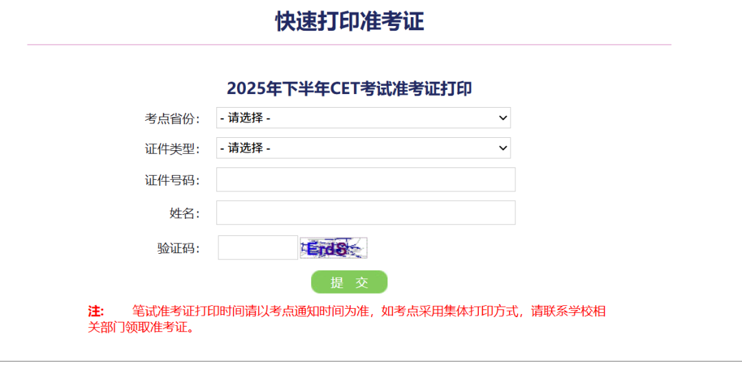 点击进入“快速打印准考证”,输入考点省份、证件类型、证件号码、姓名、验证码进入,下载准考证并进行打印即可。