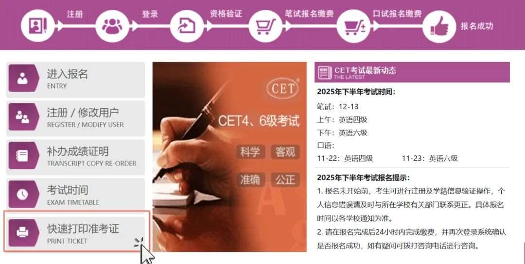 12月5日9:00起,考生可登录全国大学生英语四六级考试网站(cet-bm.neea.edu.cn)打印笔试准考证。