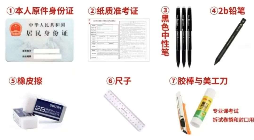 另外还有量角器、针管笔、彩铅等,各专业所需用品存在差异,一切以准考证报考院校说明为准。