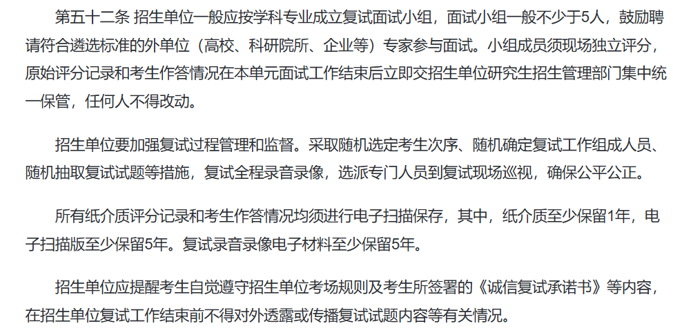 2026考研复试从工作人员遴选、培训考核到复试过程的全程录音录像、材料长期保存,形成了全流程监管体系,同时通过明确禁止自主划线低于国家线(全国统一命题科目)、规范面试小组组成等措施,进一步压缩人为操作空间。