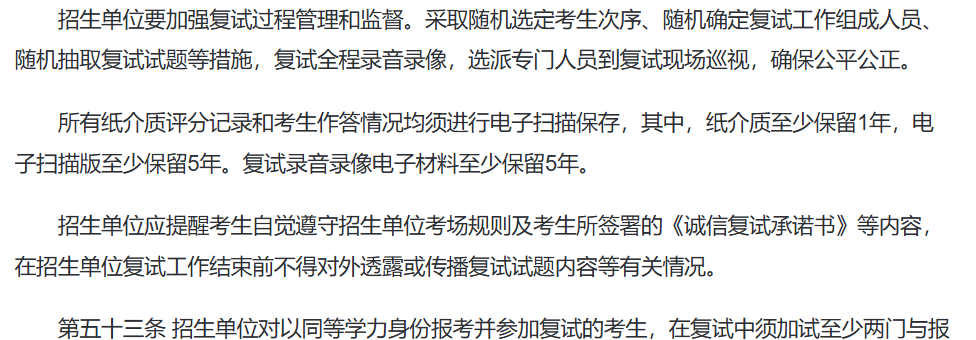 去年复试中,明确实行“三随机”,而今年复试除了这一点外,还明确全程录音录像,选派专人现场巡视;纸介质评分记录及考生作答情况将会被电子扫描保存,录音录像也会保留至少五年。
