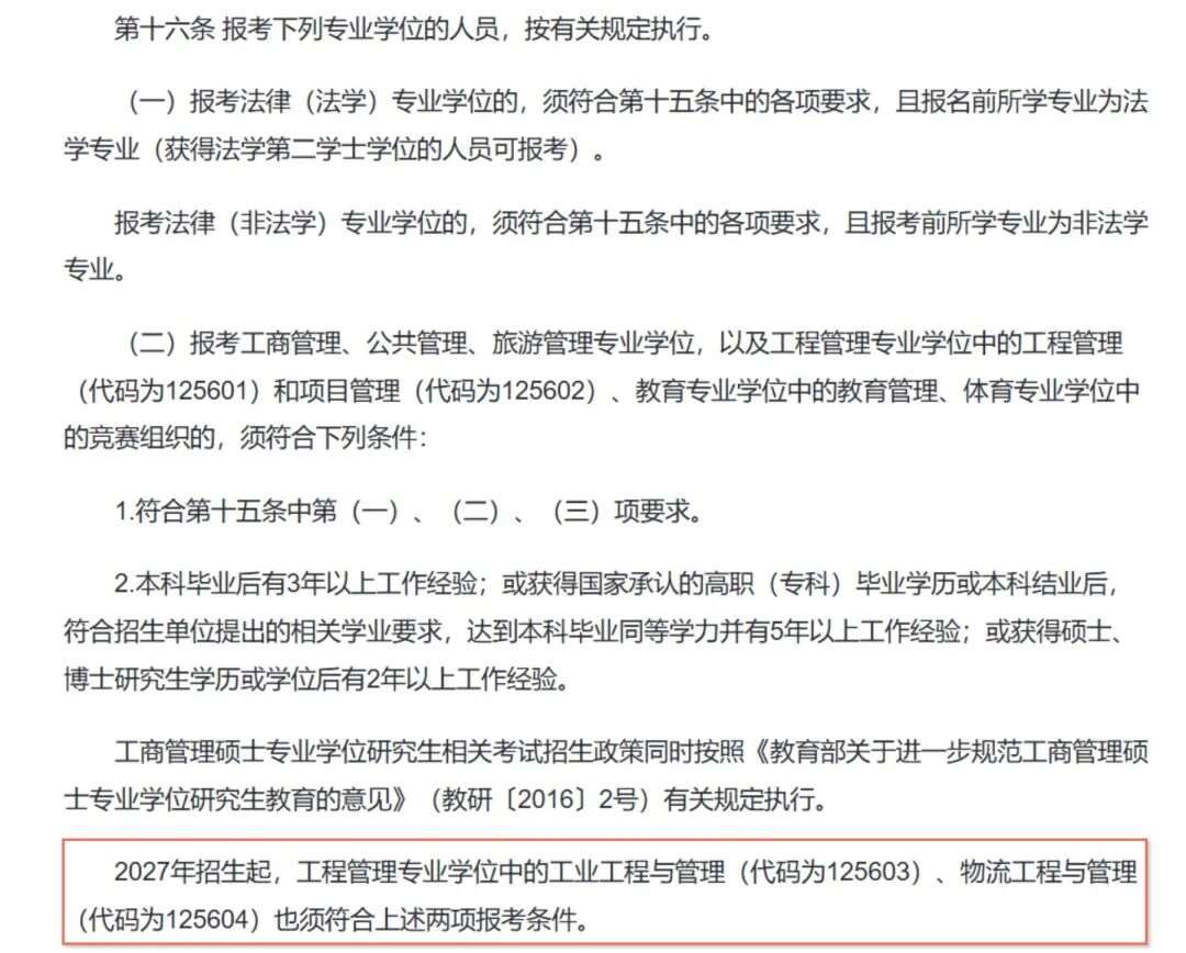 此前工业工程与管理、物流工程与管理允许应届生报考,从下一次考研开始,这两个专业会与工商管理、公共管理等专业学位报考条件统一,都需要毕业工作经历。