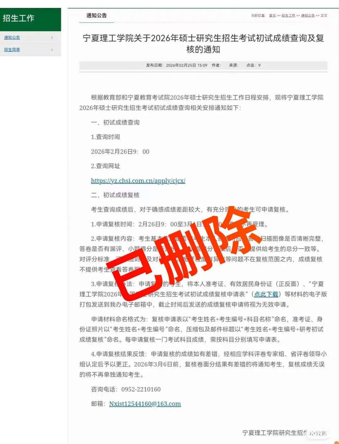 宁夏理工大学于2月25日下午3:09发布了26考研*查询及复核通知,查询时间为2026年2月26日9:00。