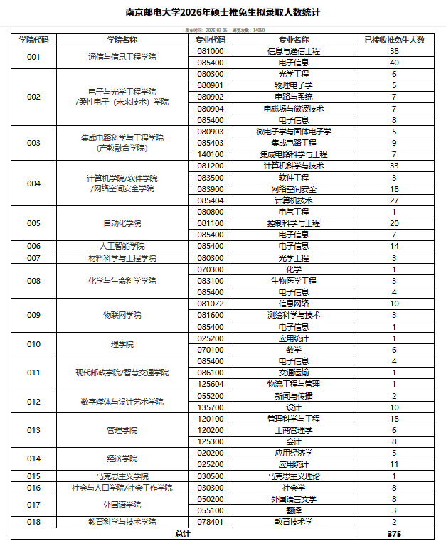 南邮通信与信息工程学院(简称通院)08100目前推免生已招38人,085400招收了推免生40人;与去年相比,今年推免名额属于激增,直接压缩了统考招生名额。若不扩招,今年通院专硕的实际统考招生人数很可能低于去年,竞争进一步白热化。