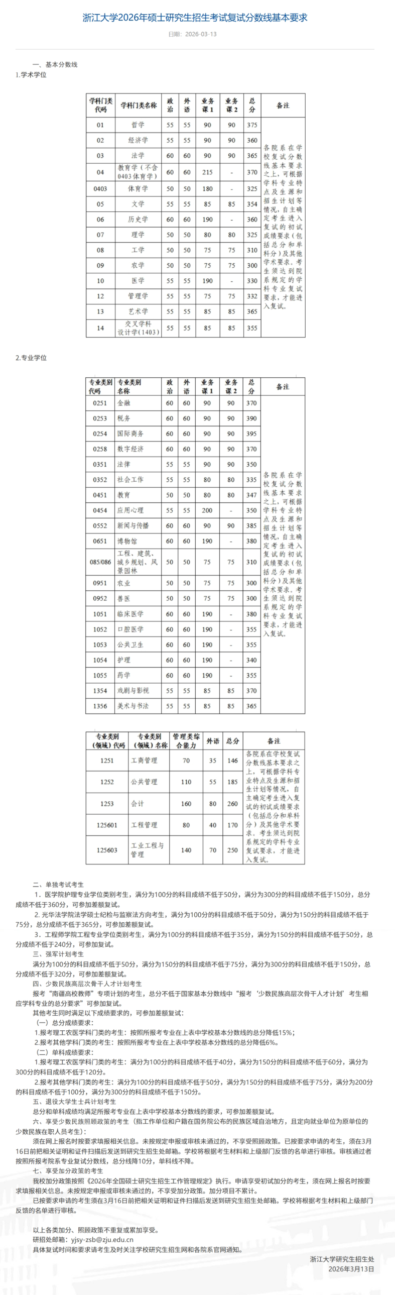 浙江大学复试线普遍上涨,且涨幅较大。学硕上涨区间为3-30分,法学上涨30分,教育学上涨29分,专硕上涨幅度较大,0251金融上涨40分