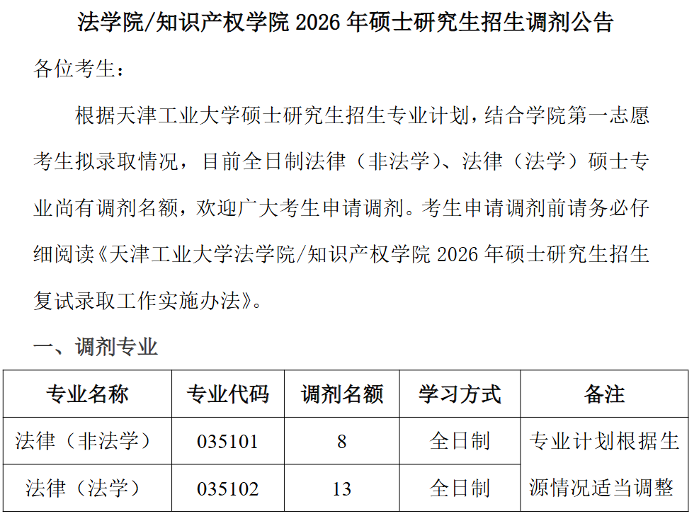 天津工业大学法学院/知识产权学院:调剂系统开通时间为2026年4月8日0时至12时