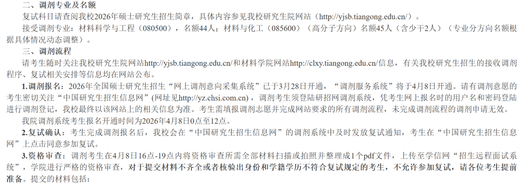 天津工业大学材料科学与工程学院,调剂报名系统开通时间为2026年4月8日0点至12点。