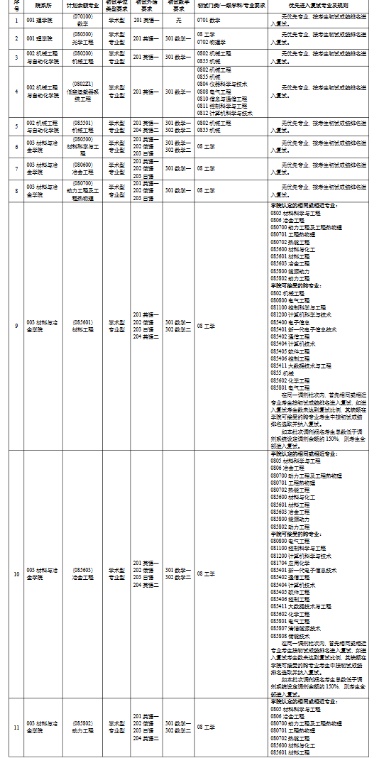 考生第*志愿报考专业为材料与化工(0856)、材料科学与工程(0805)、冶金工程(0806)及其下属各专业优先;其次为化学工程与技术(0817)、电子信息(0854)、能源动力(0858)、核科学与技术(0827)及其下属各专业。
