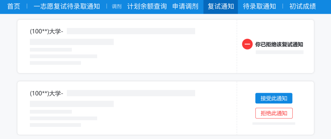 ①考生拒绝招生单位发送的复试或待录取通知;②招生单位明确不接收考生参加复试;③锁定时间到达后,招生单位未明确受理意见。