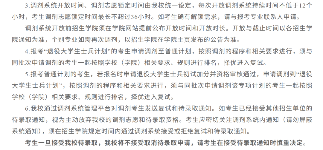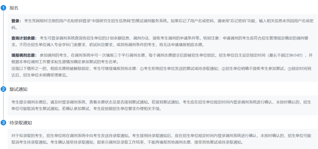 特别注意:填报调剂志愿前,要充分了解招生单位调剂要求,接受考生调剂的时间、基本要求、工作程序、复试录取办法、咨询渠道等信息,以及相关专业不同学习方式(全日制和非全日制)在培养、奖助等方面的差异,按该单位设置的调入专业门类要求、初试科目要求,或其他调剂条件进行填报。