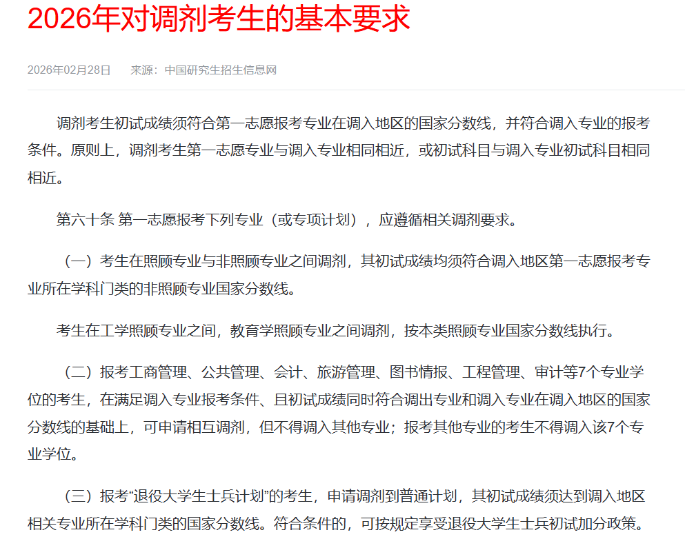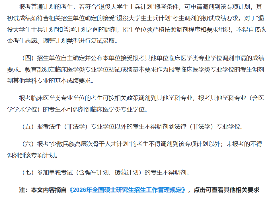 计划必须合规:符合调入专业的报考条件,专项计划(如退役大学生士兵计划)调剂需遵循对应规则,普通计划与专项计划调剂有明确限制。