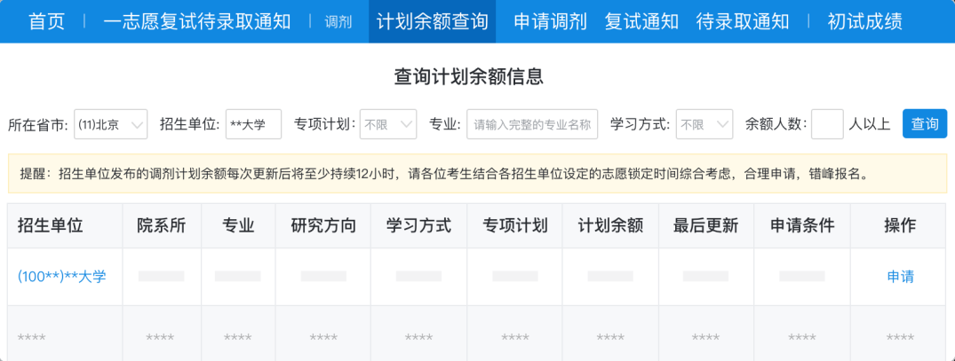 查询各招生单位的计划余额信息、调剂办法、接收考生调剂的申请条件等。