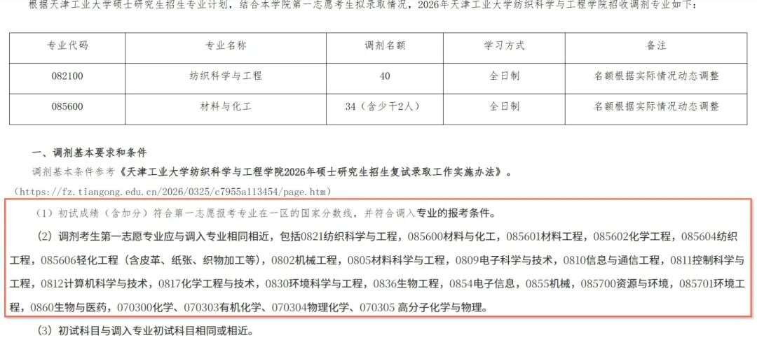 专业需要匹配:调入专业与一志愿专业相同或相近,初试科目一致或相近,原则上专业代码前两位相同,跨门类调剂基本不被允许;