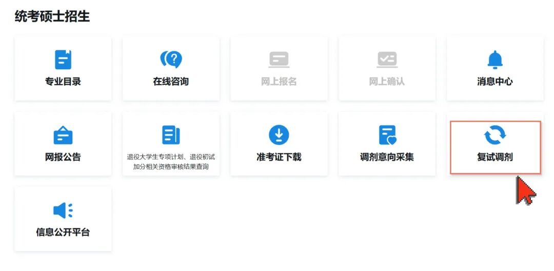 考生登录“中国研究生招生信息网”复试调剂服务系统。