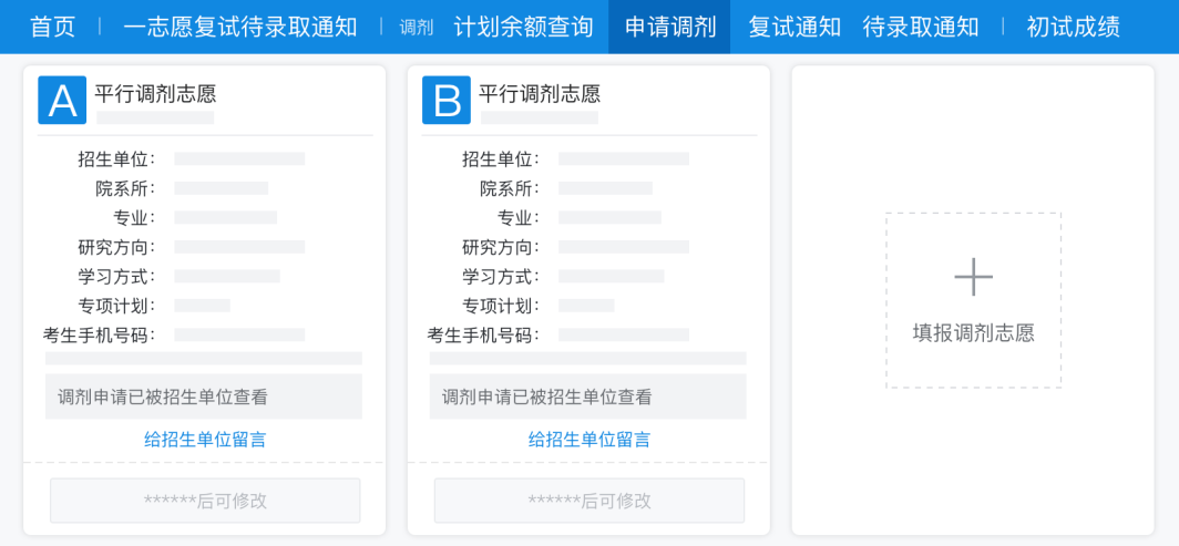 考生提交调剂志愿后,及时查看志愿状态及是否接到复试通知。
